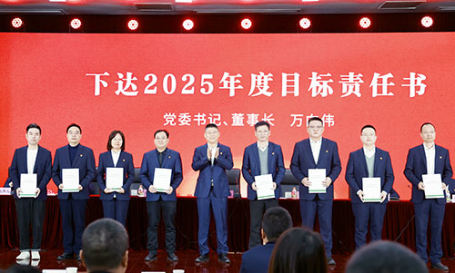 集團黨委書記、董事長萬向偉代表集團黨委、董事會給各單位(部室)下達2025年度目標責任書,并作《推動深化改革 厚植發展動力 為杭州燃氣高質量發展書寫新的時代華章》重要講話,從“‘國企擔當、迎難而上、文化興企、產業升級、黨建引領、行業頭雁’風采六個維度彰顯杭燃發展的高度、力度、厚度、廣度、深度、速度”,全面總結了集團2024年的主要工作成效。萬董表示,2025年,要緊緊圍繞“以全面深化改革推動高質量發展”的主線,“發展與安全”并重、“社會效益與經濟效益”并舉,不斷書寫杭州燃氣高質量發展新篇章。并在此基礎上重點提出四個發展目標:一是立足全局,推動全產業鏈做強做優做大;二是做精做細,構建燃氣特色安全治理體系;三是卓越管理,挖潛增效夯實企業內生動能;四是黨建強基,凝聚全員干事創業的精氣神。