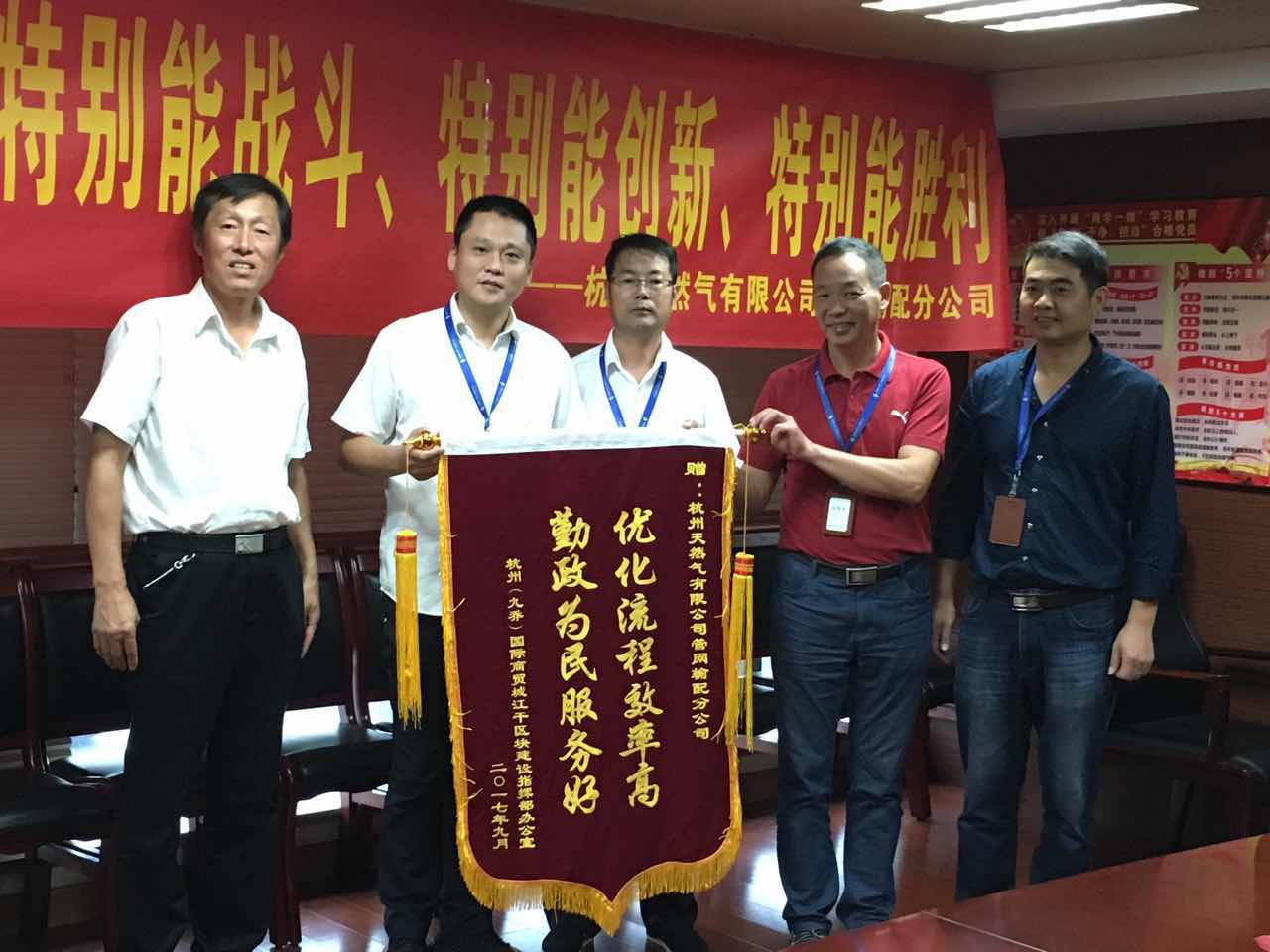 9月28日上午,杭州(九喬)國際商貿城江干區塊建設指揮部辦公室送來一面寫有“優化流程效率高 勤政為民服務好”的錦旗,對杭天公司熱情高效的服務、施工人員認真負責的工作態度給予了高度的贊揚并表示由衷的感謝。