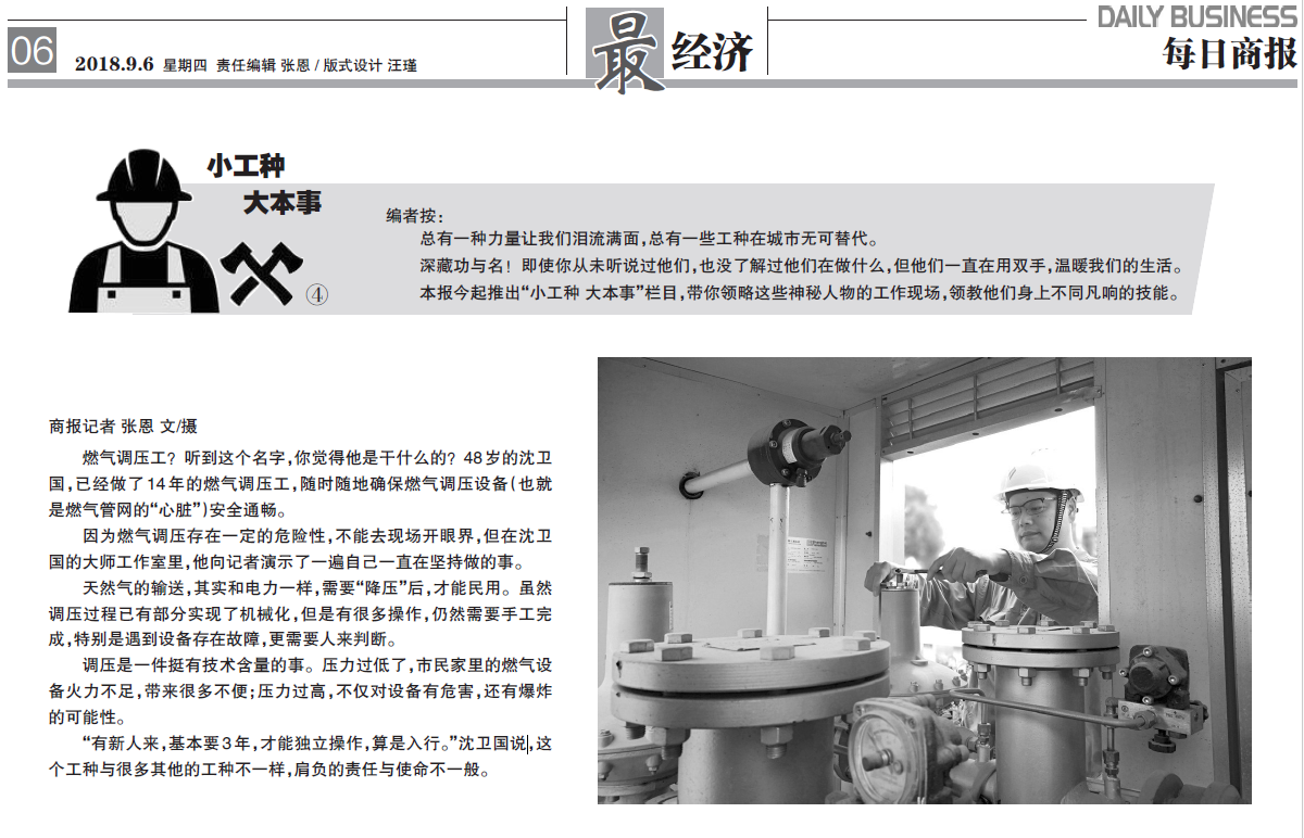 “從事這一工種的,整個杭州不會超過100人,清一色全是男丁。”沈衛國說,即使是在全國范圍內,調壓工也全是男丁。原因不難理解,調壓設備很重,一些大型零部件甚至可以達到200-300公斤,即使是男的調壓工,更換起來也得有人在一旁幫忙。