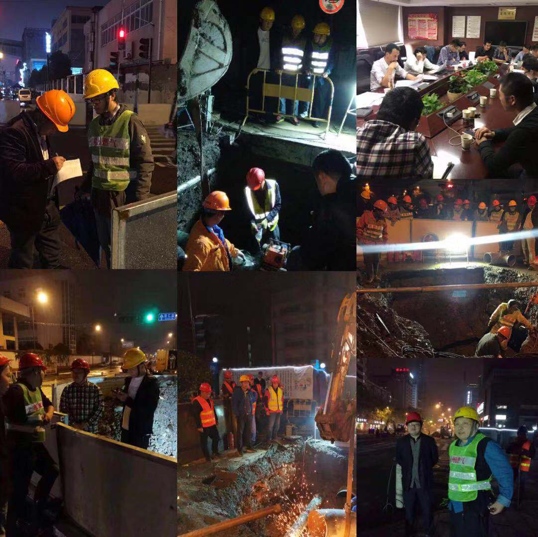 還未來得及喘口氣,他們的身影又出現在地鐵4號線華中路站第一期工程工地,該處涉及631米燃氣管道需遷改,割接點共有17處。分公司主動配合地鐵主體工程進度,及時與地鐵集團、主體施工單位、設計單位等協調施工管位、安排夜間過路等問題,強化管理,嚴把工程建設質量關,深化監管,狠抓安全生產管理。為確保停氣用戶第二天早晨能及時恢復用氣及涉及路面交通不受影響,分公司安排施工人員、設備機械提前進場完成工作面開挖。割接當晚,面對突如其來的大雨,馬上在每處工作坑搭設防雨棚,并開動水泵進行抽水,做好安全防護措施,至 11月6日凌晨順利完成中壓管線碰接工作。