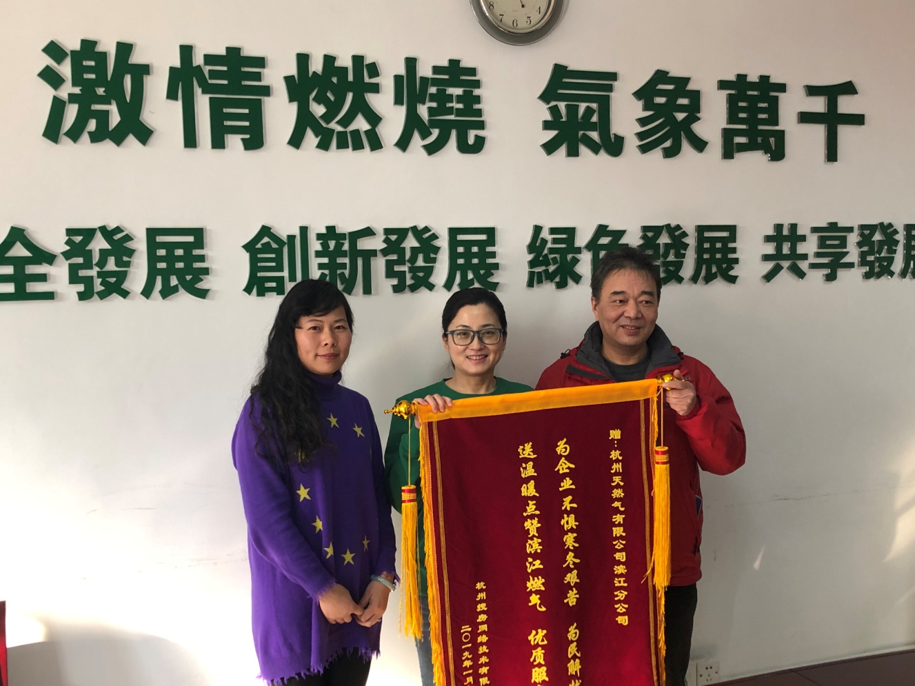 1月21日下午,搜房網軟件開發基地項目負責人吳薇女士向濱江分公司送上寫有“為企業不懼寒冬艱苦,為民解憂;送溫暖點贊濱江燃氣,優質服務”的錦旗。