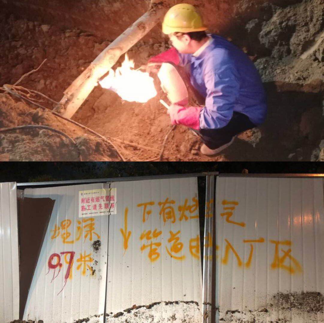 經(jīng)了解,該處為電力施工工地,挖破燃?xì)夤艿赖氖菑U土外運(yùn)單位。就在挖破點(diǎn)旁邊1.5米的施工圍護(hù)上,“附近有燃?xì)夤艿馈钡奶崾疽约奥裆睢⑽恢玫挠推針?biāo)注清晰可見(jiàn)。事件發(fā)生后,杭天公司HSSE部第一時(shí)間將該處第三方破壞上報(bào)至杭州市城管委行政執(zhí)法執(zhí)法大隊(duì),要求進(jìn)行處理。