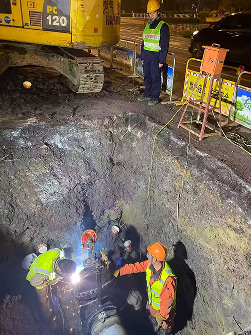 精準施策,徹底消除隱患。多次修改并完善施工方案,最終確定先進行閥門氣密性測試的方案。21日閥門廠家技術人員趕赴現場對2551閥門進行關閉性測試,24日搶修工作進入關鍵階段,三臺挖掘機同時進行施工作業,隨著新閥門與管道順利對接、直管段更換短管、彎頭處重新更換,于25日早上5時供氣系統恢復正常運行。這場歷時五晝夜的攻堅戰,終以徹底勝利畫上句號。