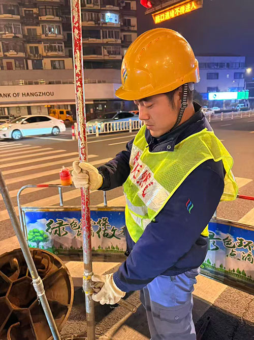初現異常,迅速響應排查。1月16日,PPB級激光巡檢車在登云路莫干山路口東北角檢測到燃氣濃度異常。北大橋運行管理站接報后迅速集結搶修力量趕赴現場,初步鎖定疑似漏點位于路口西北側。然而該處車流量較大,白天無法進行開挖排查。為確保安全,站內安排人員現場監護直至晚高峰結束,才對該區域進行開挖。但臨近早高峰開挖工作只能暫停,現場繼續安排人員監護。