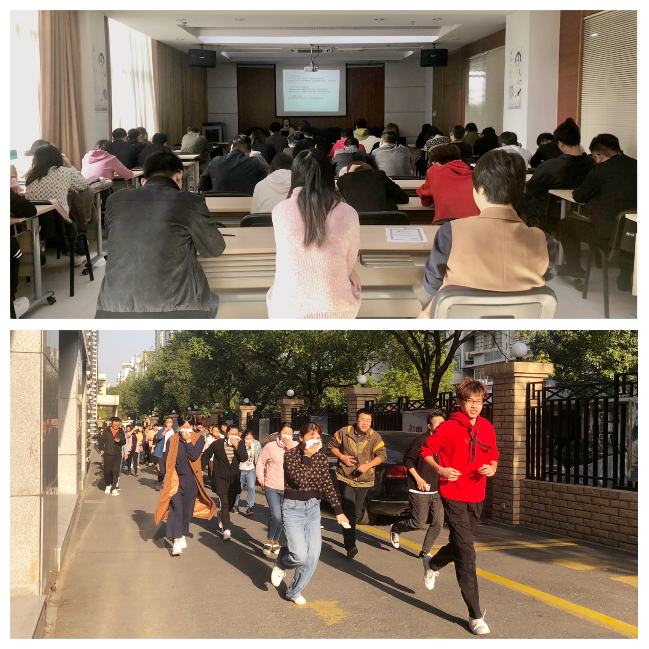 下午3點20分,海月基地辦公大樓突然響起刺耳的火警聲,隨機煙霧大作。安保人員確認火災情況后立即上報,并根據指令啟動火災事故應急預案,并切斷辦公大樓非消防總電源。全體在崗員工聽到警報命令后立刻用濕毛巾捂住口鼻,在各樓層疏導員和保安的引導下快速、有序、安全地撤離至公司西大門應急逃生集結點。在演習中,工程鐵軍表現出較高的安全意識:迅速撤離、秩序疏散,不恐慌、不懈怠。