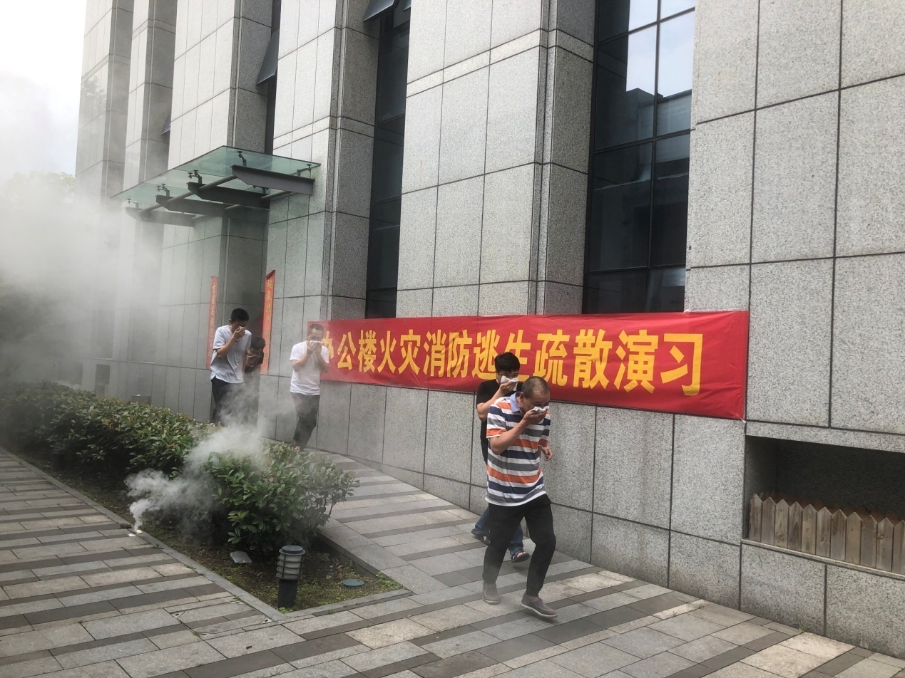 警報響起,清江路辦公樓一層突然起火冒出濃煙,安保人員確認火災情況后第一時間上報,并根據指令啟動火災事故應急預案。各層疏散員立即通過口哨引導員工撤離,并關閉各層電源開關。所有員工在樓層疏散員的引導下,按要求使用消防逃生毛巾迅速有序地通過安全出口撤離辦公樓。疏散引導員在確認各樓層已無其他人員后迅速撤離至集合點,將逃生人員情況匯報搶險救援組組長。