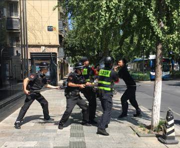 8月19日14時,在燃氣大廈大廳南門突發驚險一幕,1名手持兇器的“歹徒”突然吼叫著沖入大廳企圖實施恐怖破壞,大廈執勤保安和附近巡邏協警果斷出擊、迅速生擒控制“歹徒”。原來,這是西溪派出所在燃氣大廈開展的一次反恐防暴突擊演練。