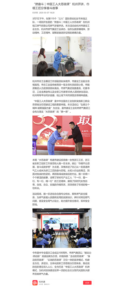 3月7日下午,在第115個(gè)“三八”國(guó)際勞動(dòng)?jì)D女節(jié)來(lái)臨之際,一場(chǎng)別開(kāi)生面的“燃奮斗|中國(guó)工人大思政課”在杭州錢(qián)江燃?xì)庥邢薰救細(xì)鈱W(xué)堂開(kāi)講。本次活動(dòng)由杭州市建設(shè)工會(huì)主辦,杭州市燃?xì)饧瘓F(tuán)工會(huì)承辦,旨在弘揚(yáng)勞模精神、勞動(dòng)精神、工匠精神,凝聚起奮進(jìn)新征程的磅礴力量。