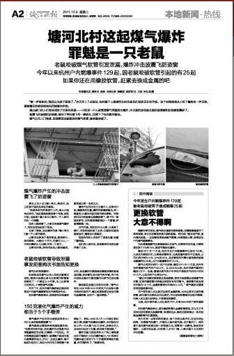 截至2011年11月底,杭州市區戶內燃爆事件已發生129起。從發生的原因分析,主要是皮管使用、灶具質量和使用不當造成,占的比例分別為42%、32%和8.5%,在皮管使用問題中被老鼠咬破造成燃爆的為25起,占戶內燃爆事件的19.4%。
