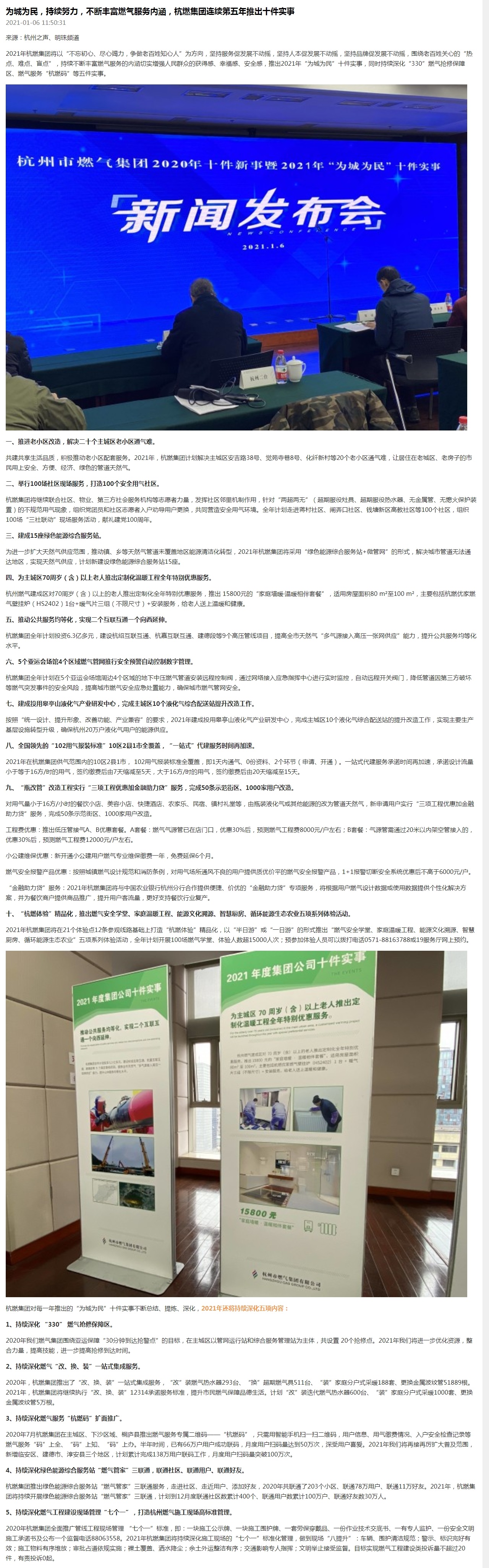 杭燃集團對每一年推出的“為城為民”十件實事不斷總結、提煉、深化,2021年還將持續深化五項內容: