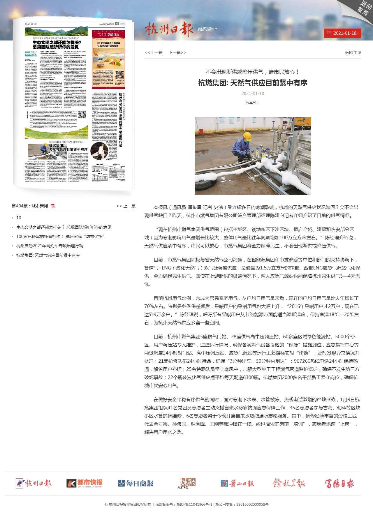 “現在杭州市燃氣集團供氣范圍(包括主城區、錢塘新區下沙區塊、桐廬全域、建德和臨安部分區域)因為寒潮影響用氣量增長比較大,整體用氣量比往年同期增加100萬立方米左右。”陳經理介紹說,天然氣供應緊中有序,市民可以放心,市燃氣集團將全力保障民生,不會出現斷供或降壓供氣。
