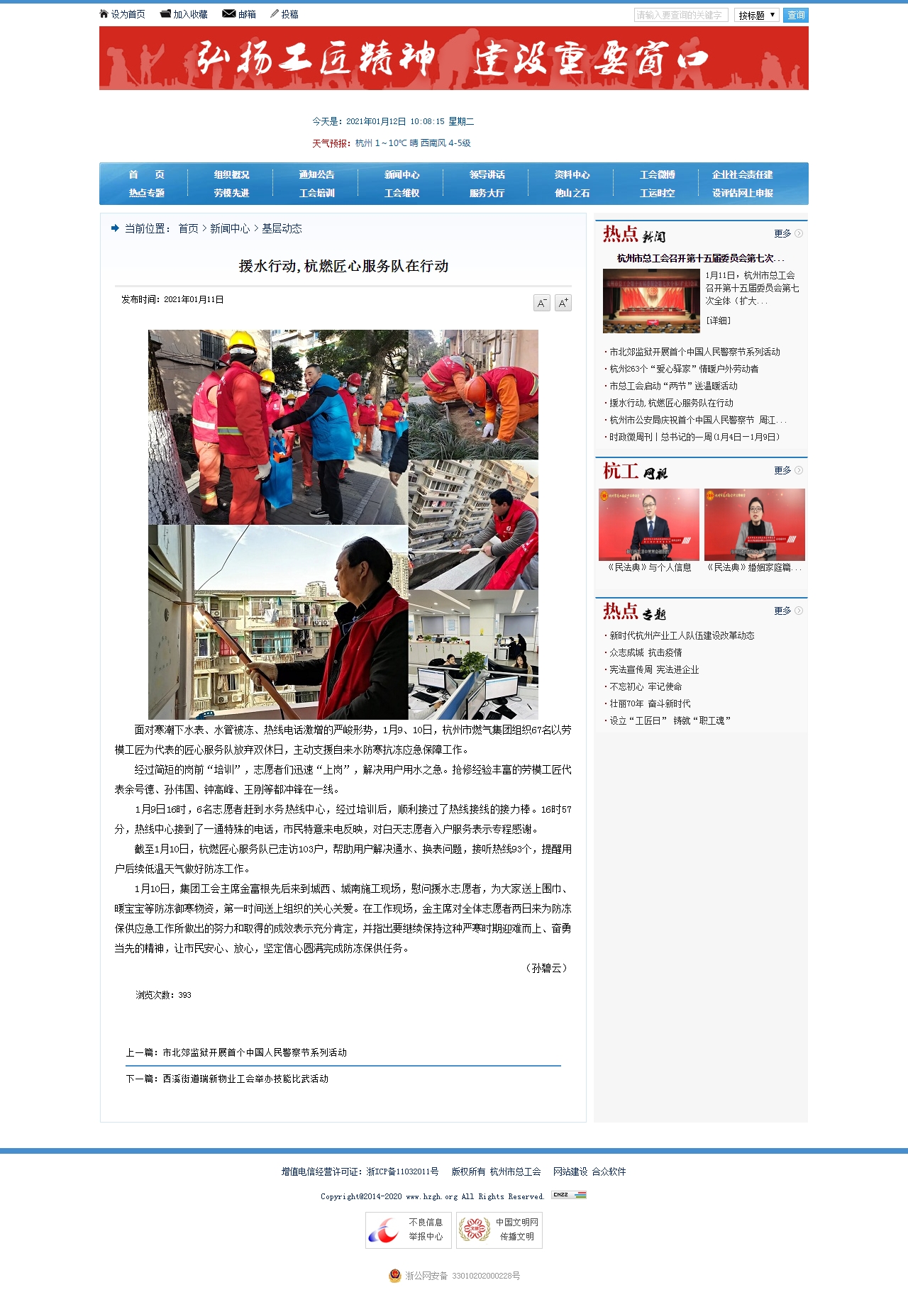 面對寒潮下水表、水管被凍、熱線電話激增的嚴(yán)峻形勢,1月9、10日,杭州市燃?xì)饧瘓F組織67名以勞模工匠為代表的匠心服務(wù)隊放棄雙休日,主動支援自來水防寒抗凍應(yīng)急保障工作。