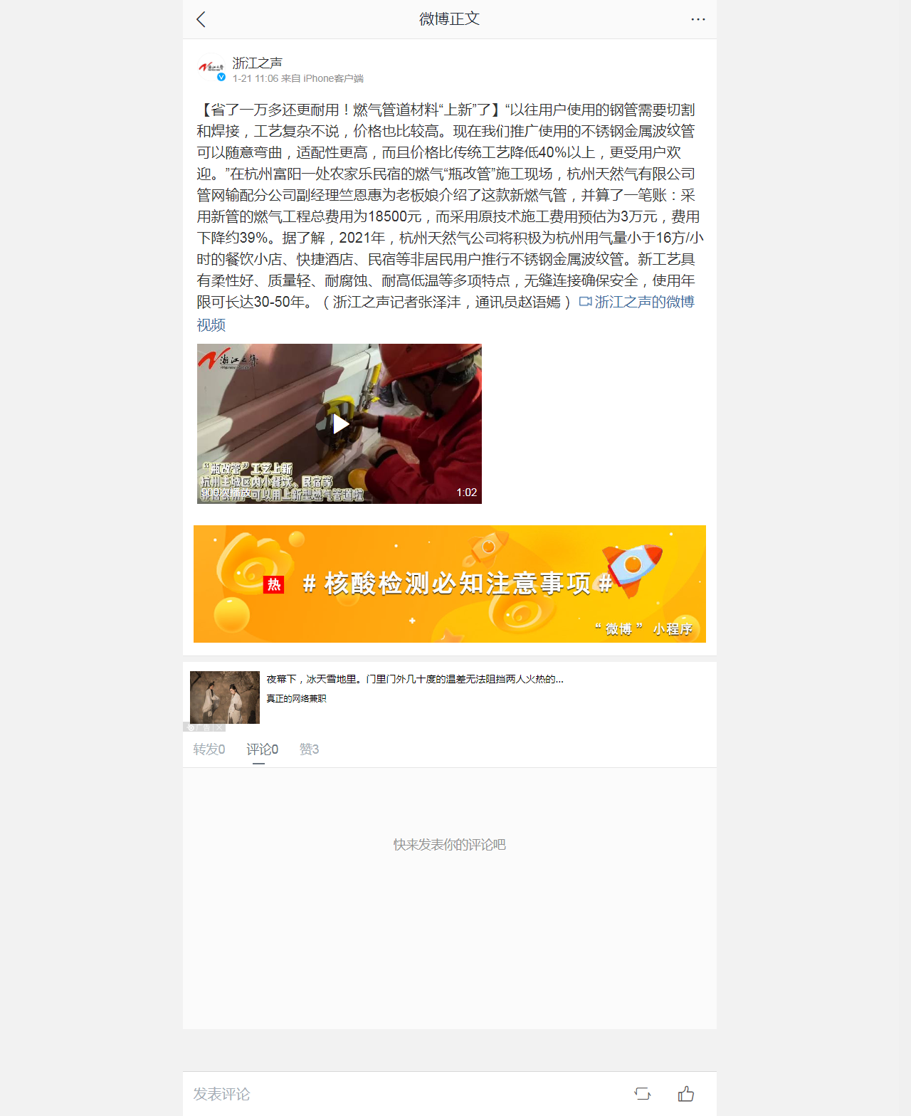 “以往用戶使用的鋼管需要切割和焊接,工藝復雜不說,價格也比較高,F在我們推廣使用的不銹鋼金屬波紋管可以隨意彎曲,適配性更高,而且價格比傳統工藝降低40%以上,更受用戶歡迎。”在杭州富陽一處農家樂民宿的燃氣“瓶改管”施工現場,杭州天然氣有限公司管網輸配分公司副經理竺恩惠為老板娘介紹了這款新燃氣管,并算了一筆賬:采用新管的燃氣工程總費用為18500元,而采用原技術施工費用預估為3萬元,費用下降約39%。據了解,2021年,杭州天然氣公司將積極為杭州用氣量小于16方/小時的餐飲小店、快捷酒店、民宿等非居民用戶推行不銹鋼金屬波紋管。新工藝具有柔性好、質量輕、耐腐蝕、耐高低溫等多項特點,無縫連接確保安全,使用年限可長達30-50年。