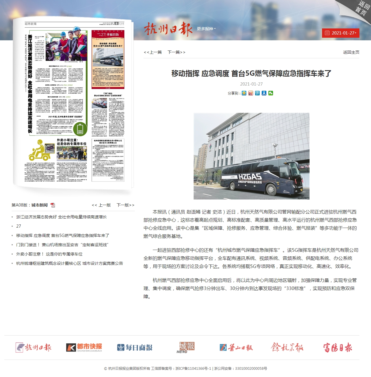 一起進(jìn)駐西部搶修中心的還有“杭州城市燃?xì)獗U蠎?yīng)急指揮車”。該5G指揮車是杭州天然氣有限公司全新的燃?xì)獗U蠎?yīng)急移動指揮平臺,全車配有通訊系統(tǒng)、視頻系統(tǒng)、音頻系統(tǒng)、供配電系統(tǒng)、辦公系統(tǒng)等,用于現(xiàn)場的方案討論及命令下達(dá)。各系統(tǒng)均搭載5G專項(xiàng)網(wǎng)絡(luò),真正實(shí)現(xiàn)移動化、高速化、效率化。