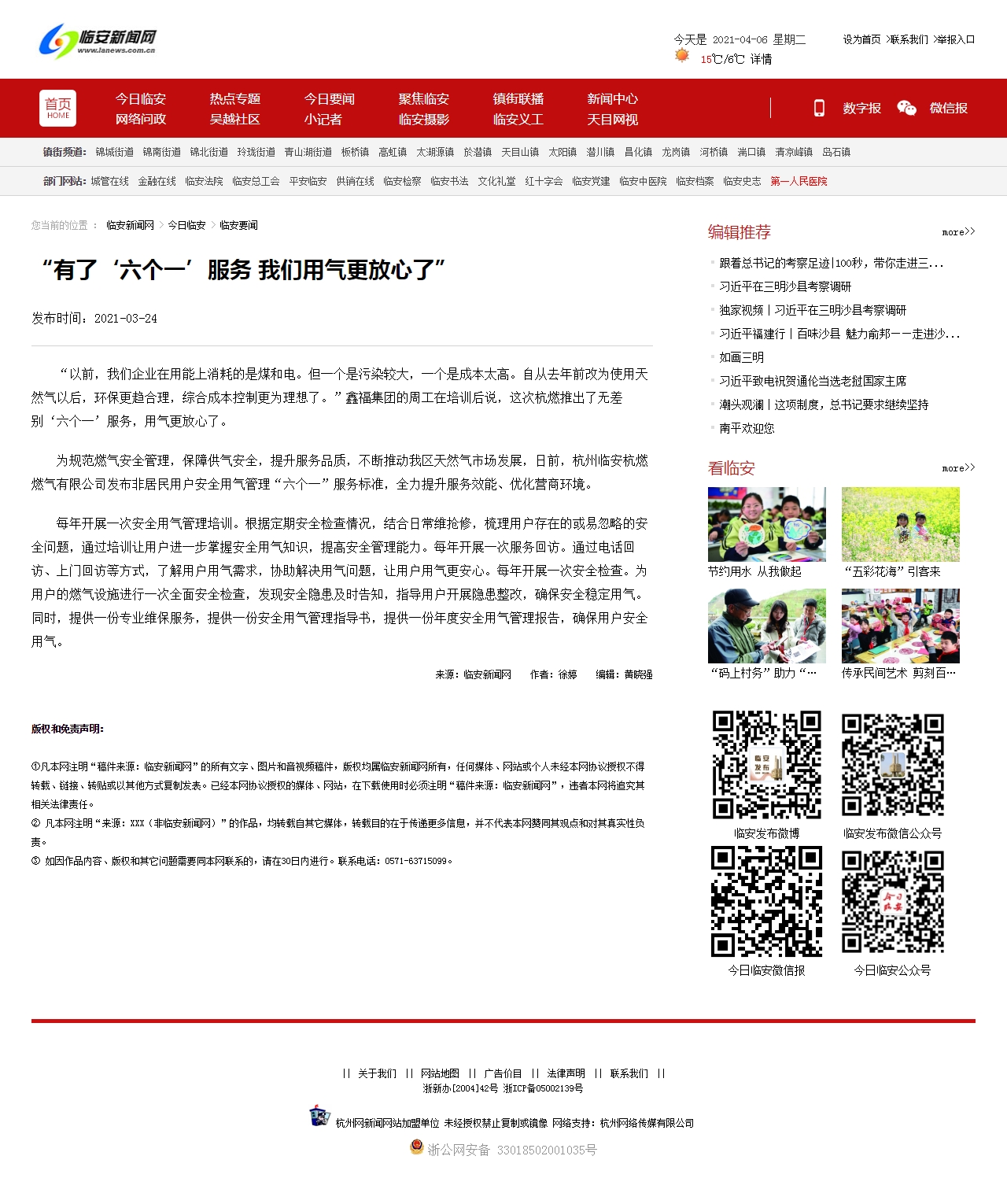 為規范燃氣安全管理,保障供氣安全,提升服務品質,不斷推動我區天然氣市場發展,日前,杭州臨安杭燃燃氣有限公司發布非居民用戶安全用氣管理“六個一”服務標準,全力提升服務效能、優化營商環境。