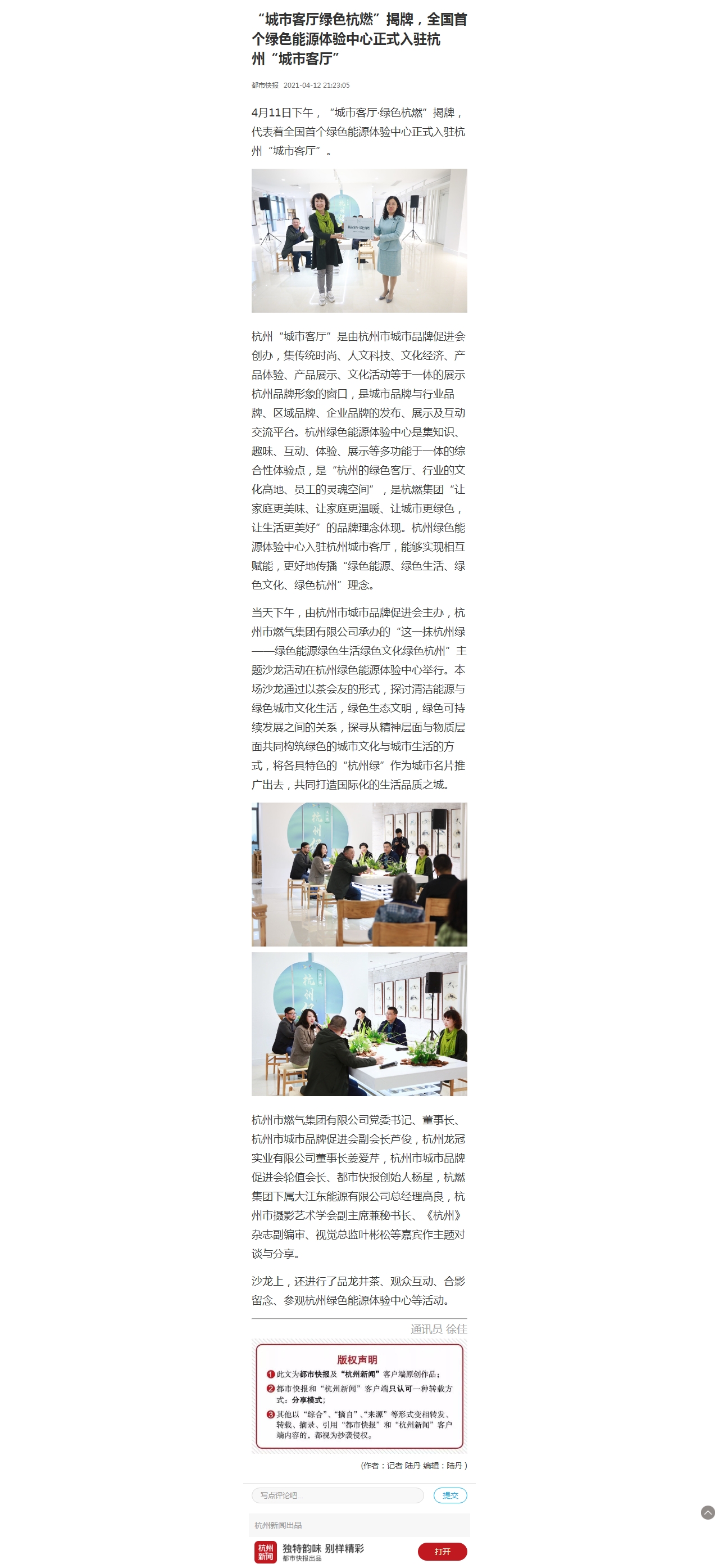4月11日下午,“城市客廳·綠色杭燃”揭牌,代表著全國首個綠色能源體驗中心正式入駐杭州“城市客廳”。