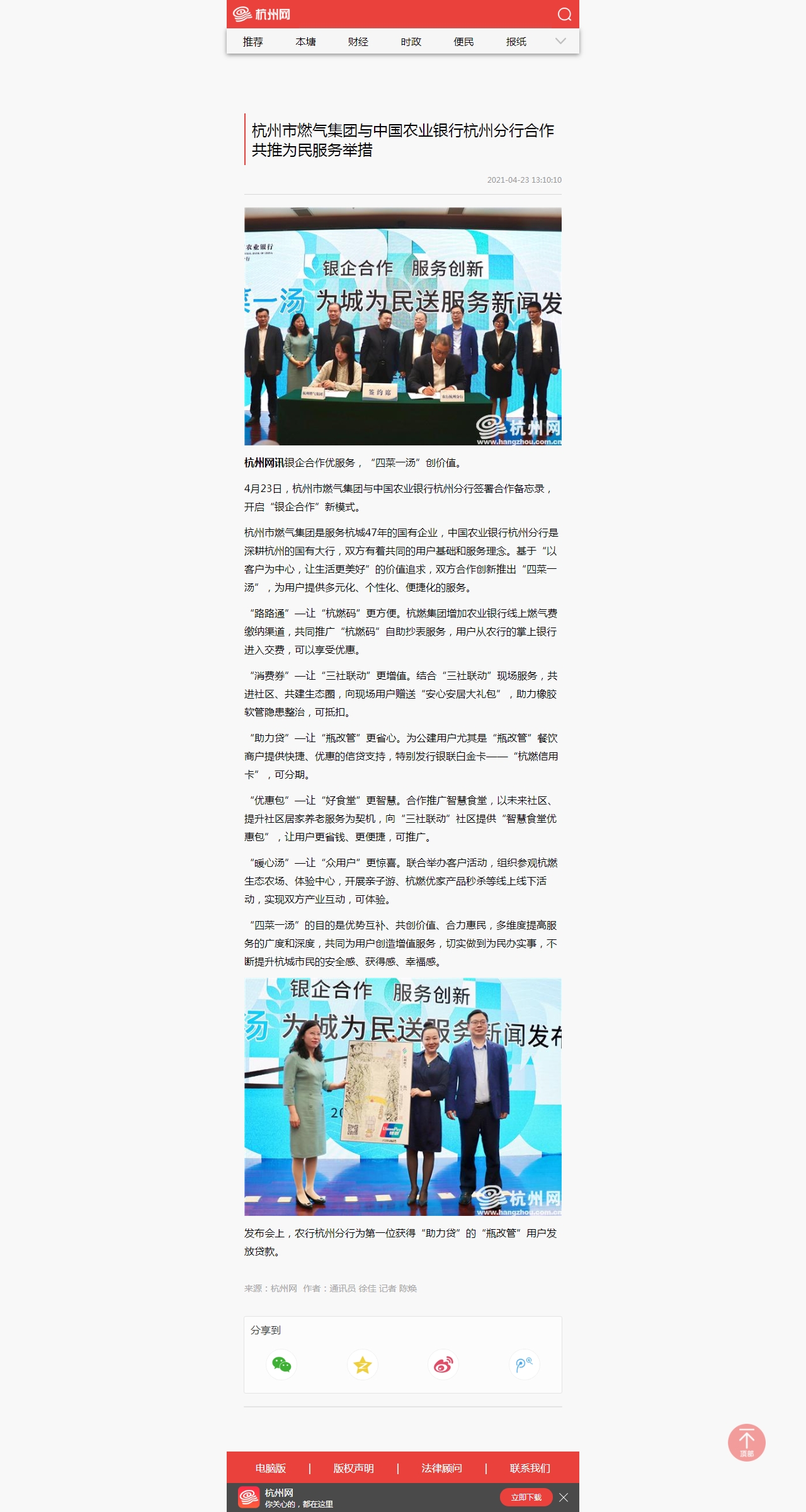 4月23日,杭州市燃氣集團與中國農業銀行杭州分行簽署合作備忘錄,開啟“銀企合作”新模式。