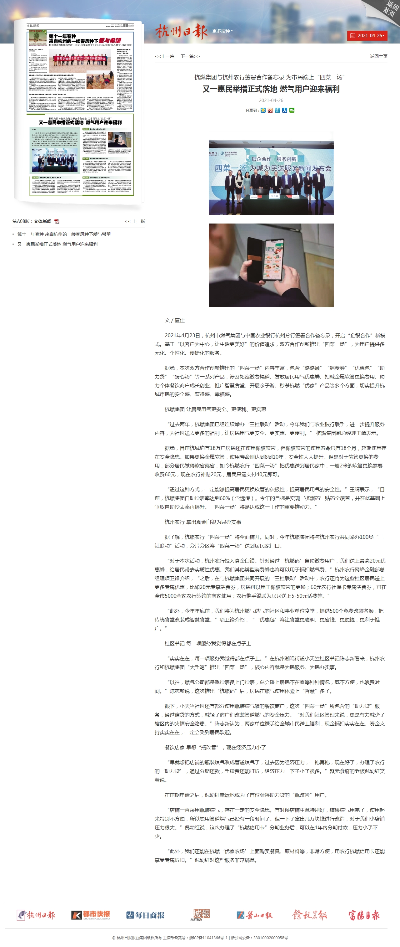 2021年4月23日,杭州市燃氣集團與中國農(nóng)業(yè)銀行杭州分行簽署合作備忘錄,開啟“企銀合作”新模式。基于“以客戶為中心,讓生活更美好”的價值追求,雙方合作創(chuàng)新推出“四菜一湯”,為用戶提供多元化、個性化、便捷化的服務。