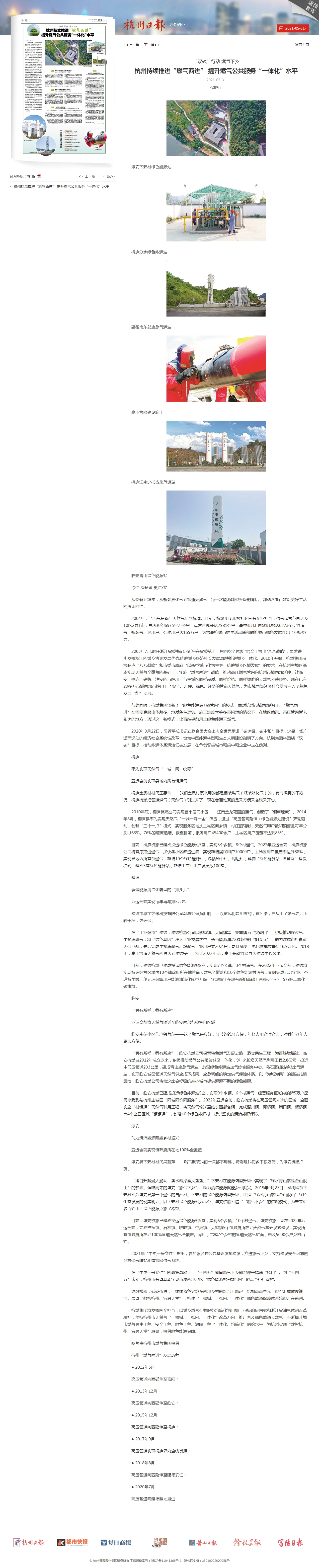 2004年,“西氣東輸”天然氣達到杭城。目前,杭燃集團積極扛起國有企業擔當,供氣運營范圍涉及10區2縣1市,總面積約6975平方公里,運營管線長達7981公里,高中低壓門站調壓站達6273個,管道氣、瓶裝氣、民用戶、公建用戶達165萬戶,為提高杭城百姓生活品質和助推城市綠色發展作出了積極努力。