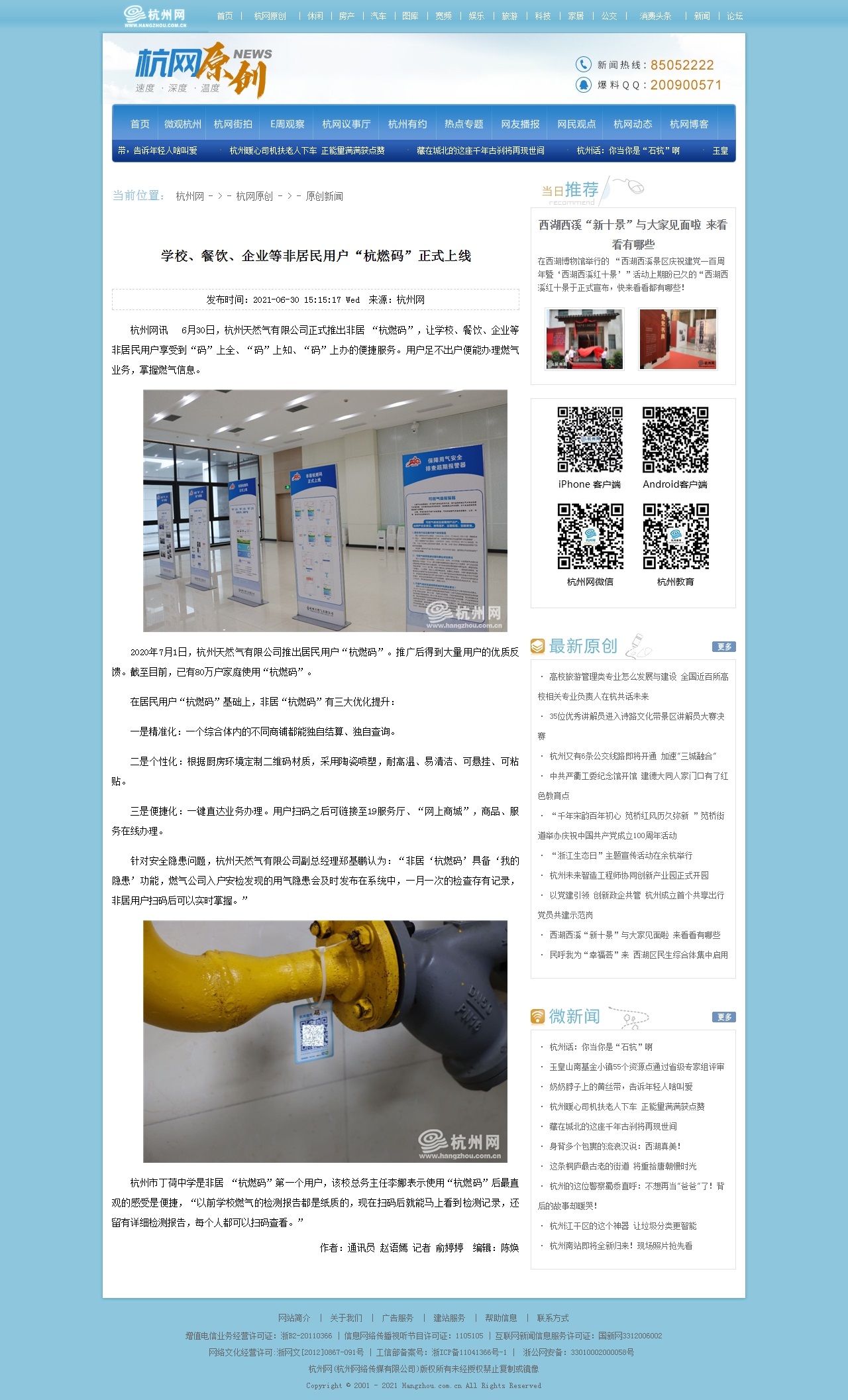 杭州網(wǎng)訊 6月30日,杭州天然氣有限公司正式推出非居 “杭燃碼”,讓學校、餐飲、企業(yè)等非居民用戶享受到“碼”上全、“碼”上知、“碼”上辦的便捷服務(wù)。用戶足不出戶便能辦理燃氣業(yè)務(wù),掌握燃氣信息。