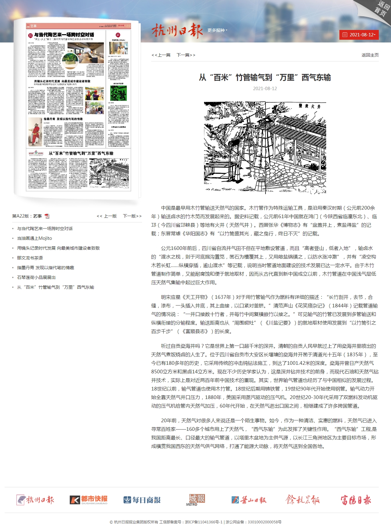 明宋應星《天工開物》(1637年)對于用竹管輸氣作為燃料有詳細的描述:“長竹剖開,去節,合縫,漆布,一頭插入井底,其上曲接,以口緊對釜臍。”清范聲山《花笑庼雜記》(1844年)記載管道輸氣的情況說:“一井口接數十竹者,并每竹中間復橫嵌竹以接之。”可見輸氣的竹管已發展到多管輸送和縱橫銜接的分輸程度。輸送距離也從“周圍砌灶”(《川鹽記要》)的就地取材使用發展到“以竹筒引之百步千步”(《富順縣志》)的長度。