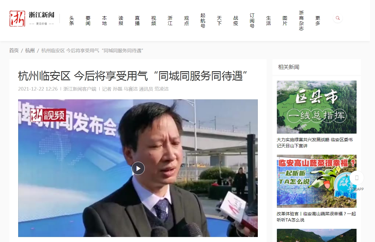 2021年12月22日,杭州臨安燃氣有限公司掛牌。記者了解到,這是在天然氣體制改革背景下,全國首家由央企、省屬國企、市屬國企合作整合資源成立的城市燃氣企業,今后60多萬臨安區百姓將享受與杭州主城區用氣“同城同服務同待遇”。