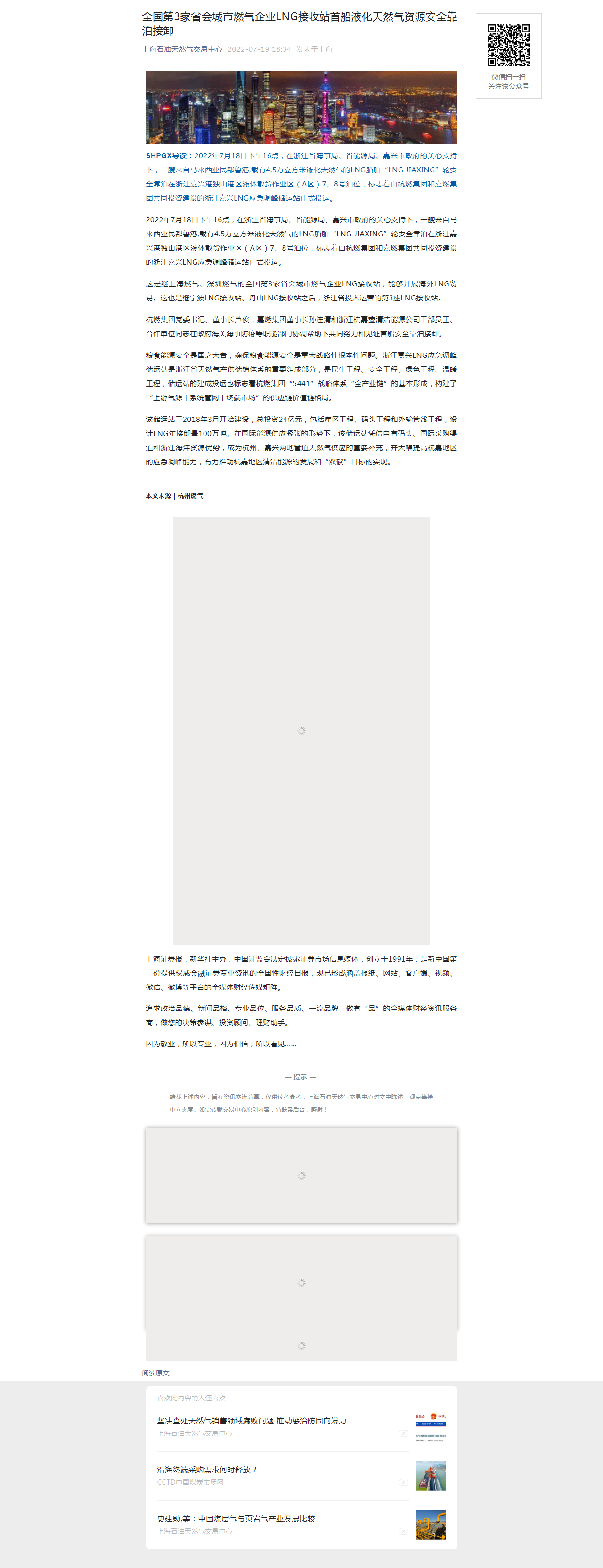 2022年7月18日下午16點,在浙江省海事局、省能源局、嘉興市政府的關心支持下,一艘來自馬來西亞民都魯港,載有4.5萬立方米液化天然氣的LNG船舶“LNG JIAXING”輪安全靠泊在浙江嘉興港獨山港區液體散貨作業區(A區)7、8號泊位,標志著由杭燃集團和嘉燃集團共同投資建設的浙江嘉興LNG應急調峰儲運站正式投運。