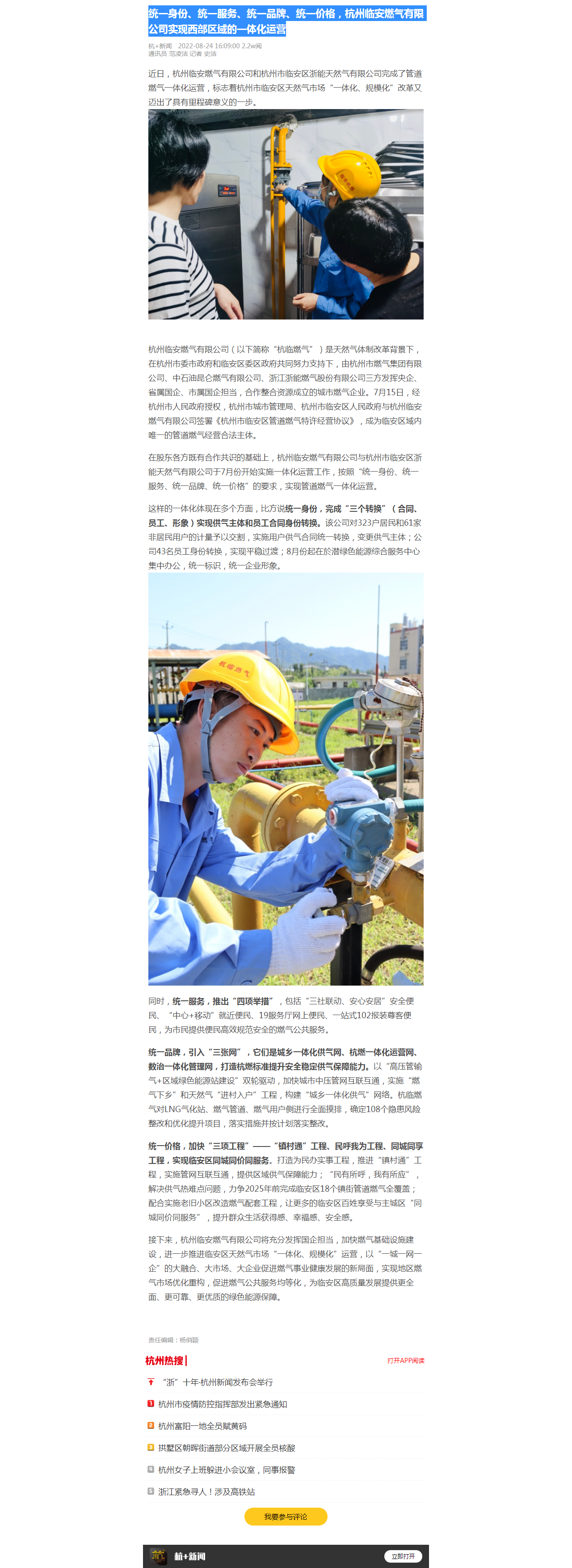 在股東各方既有合作共識的基礎上,杭州臨安燃氣有限公司與杭州市臨安區浙能天然氣有限公司于7月份開始實施一體化運營工作,按照“統一身份、統一服務、統一品牌、統一價格”的要求,實現管道燃氣一體化運營。