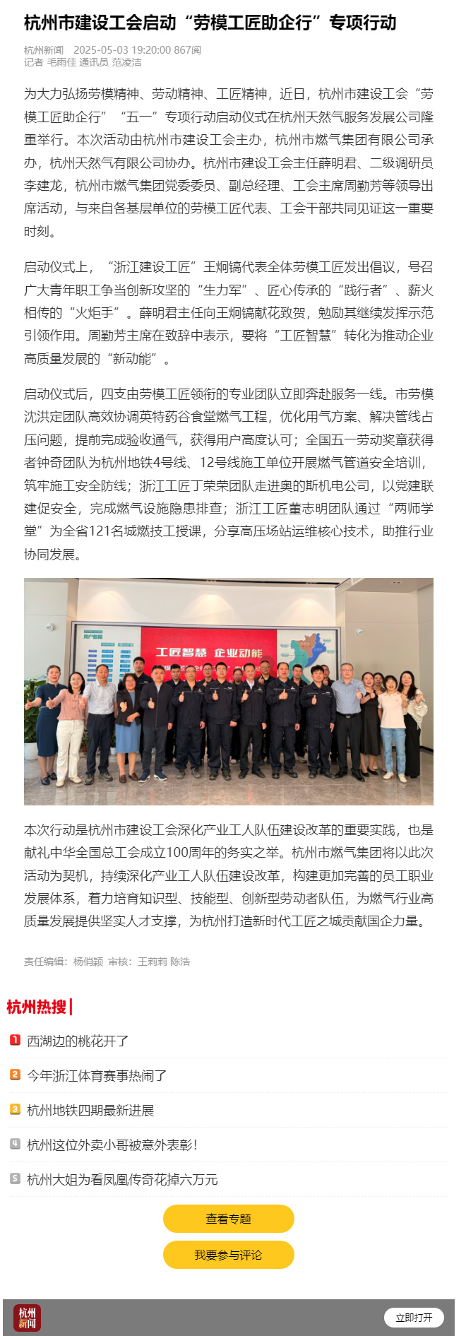 本次行動是杭州市建設(shè)工會深化產(chǎn)業(yè)工人隊伍建設(shè)改革的重要實踐,也是獻禮中華全國總工會成立100周年的務(wù)實之舉。杭州市燃氣集團將以此次活動為契機,持續(xù)深化產(chǎn)業(yè)工人隊伍建設(shè)改革,構(gòu)建更加完善的員工職業(yè)發(fā)展體系,著力培育知識型、技能型、創(chuàng)新型勞動者隊伍,為燃氣行業(yè)高質(zhì)量發(fā)展提供堅實人才支撐,為杭州打造新時代工匠之城貢獻國企力量。
