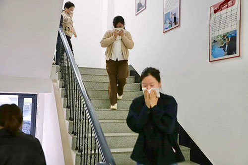 隨后開展應急疏散演練,模擬逃生演練環節。公司副總監劉忠明接到火情后立即向熱線調度中心發出緊急疏散指令,警報響起后,各部門專兼職安全員聞令而動,立即使用滅火器滅火,同時迅速開展組織引導,全體人員用濕毛巾捂住口鼻,低姿彎腰,沿預定路線從兩個消防安全出口疏散至室外安全區域。經過各部門的聯動處置與配合,火情順利控制,辦公樓恢復正常運行。演練結束后,演練總指揮劉忠明對本次演練進行了點評。
