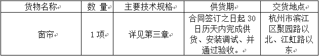 杭燃集團濱江搶修中心窗簾采購項目(項目名稱),招標人為杭州市燃氣集團有限公司,招標項目資金 自籌 ,出資比例為 100 %。該項目已具備招標條件,現對本項目進行公開招標。
